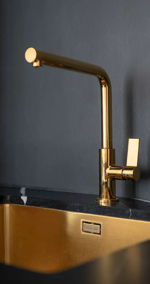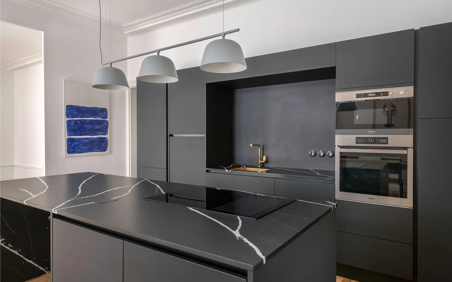Pensé comme la pièce maîtresse, le salon et la salle à manger ont été réunis pour former un espace de 55 m², baigné de lumière, où s’intègre une vaste cuisine élégante et fonctionnelle aux lignes noires rehaussées de laiton.