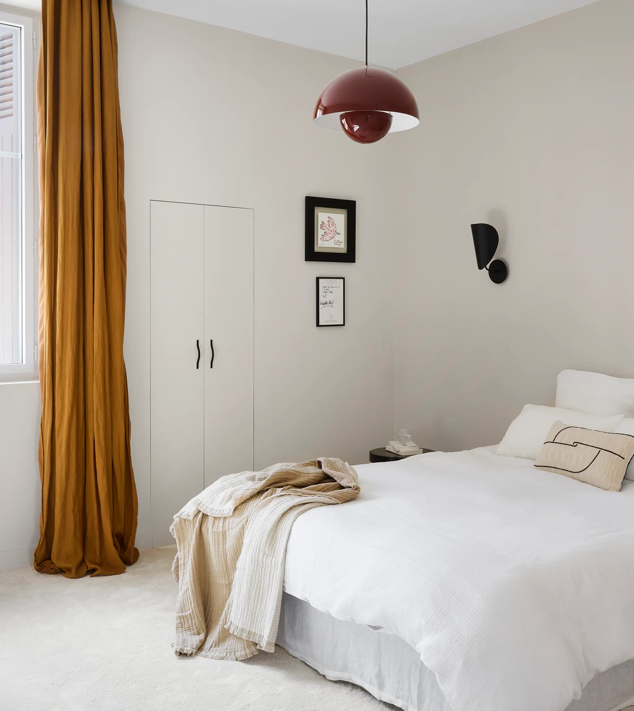 À l’étage, les espaces ont été subtilement structurés entre coin lecture, bureau et chambres enveloppantes aux nuances douces.