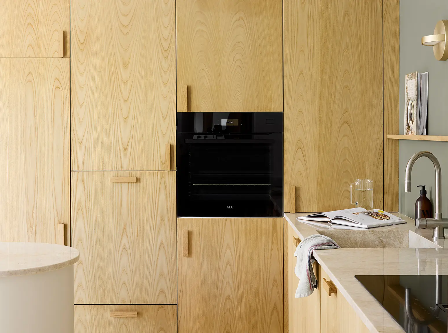 La cuisine sur-mesure, en châtaignier et granit, s’intègre dans une esthétique sobre et raffinée.